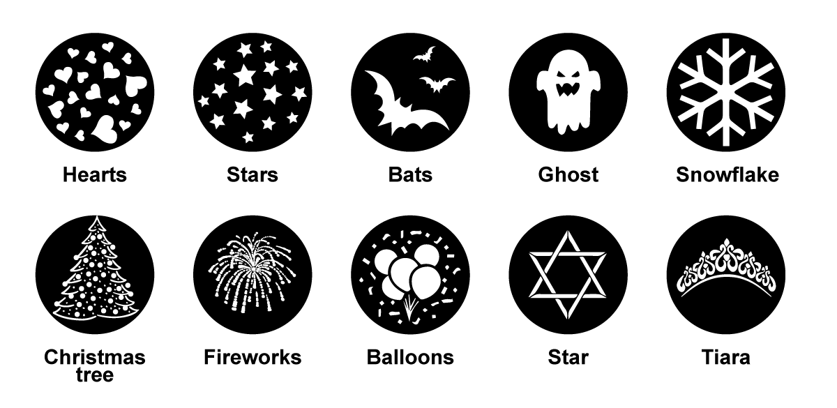 - Includes 10 popular holiday gobos